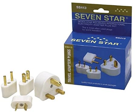 The Seven Star Polarized International Electricity Travel Adapter Plug Set includes the most used plugs by world travelers. These four polarized plugs are adaptable to nearly all electrical wall outlets throughout the world.